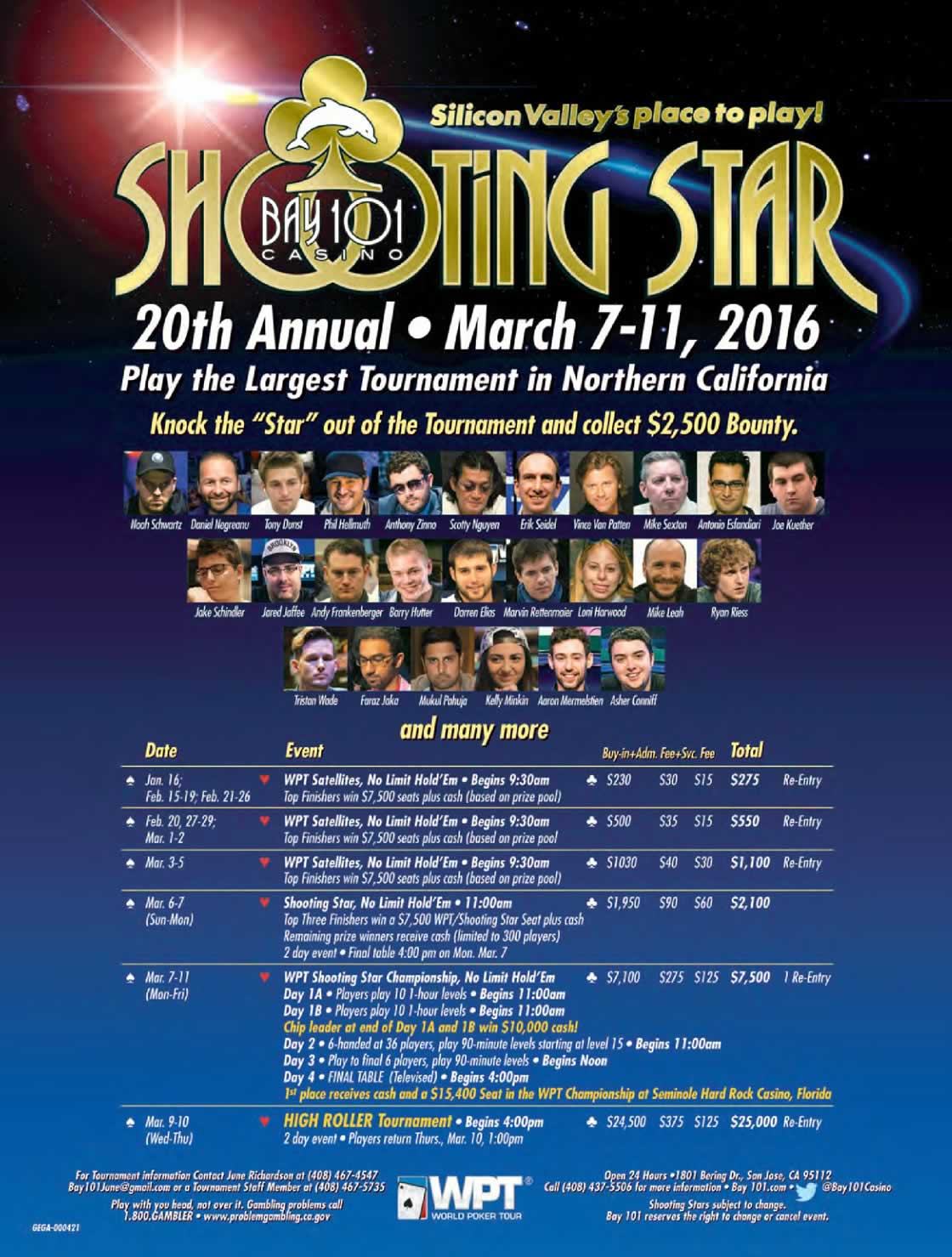 The Shooting Star at San Jose’s Bay 101 casino is the closest premiere poker tournament to Portland. It’s been on the WPT schedule since season II (they’re now in Season XIV). It started as a $5.3K buy-in, going to a $10K for most of its run, and for the past couple of years, it’s been offered as a $7.5K. It’s unique on the WPT schedule for having a $2.5K bounty on 50 “star” players seeded through the tables.
