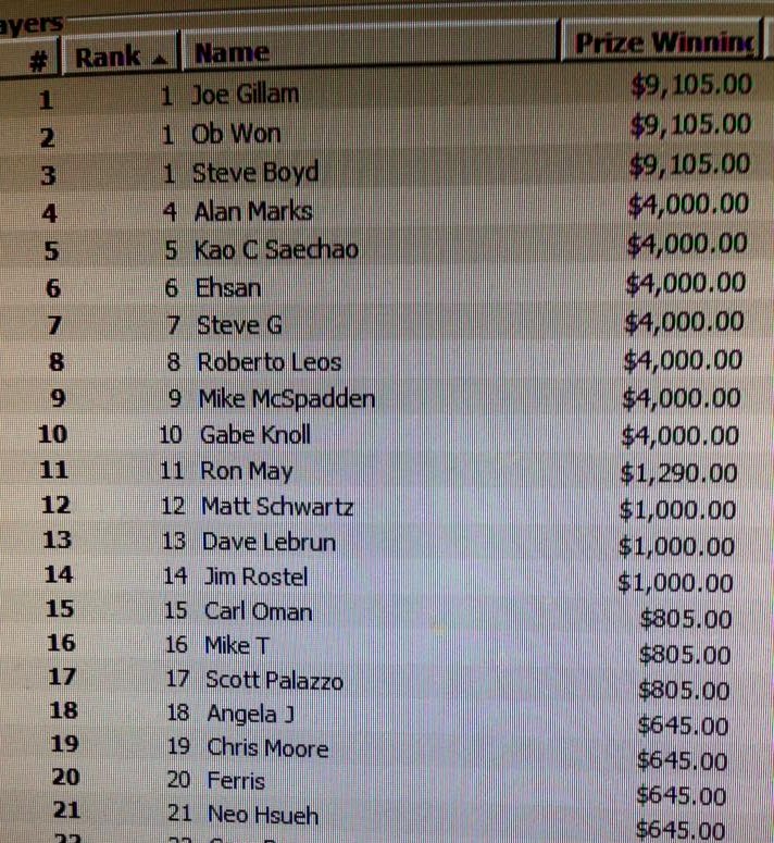 Steven Harper notched an entry into the $1.1K LAPC Main Event Satellite running on weekends preceding the Main, by cashing in one of the nightly $150 Step 1 satellites. A cash in the $1.1K Satellite (another batch run in the days just before the Main Event starts 27 February) gets you one of the coveted $10K seats. Harper also took seventh place in the $240 NLHE Big Bounty tournament on Monday, picking up eight $100 bounties to go along with the prize money. Hoping to get down to LA myself in the next few weeks.