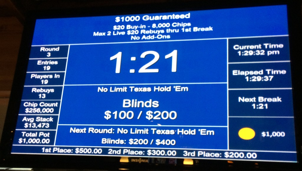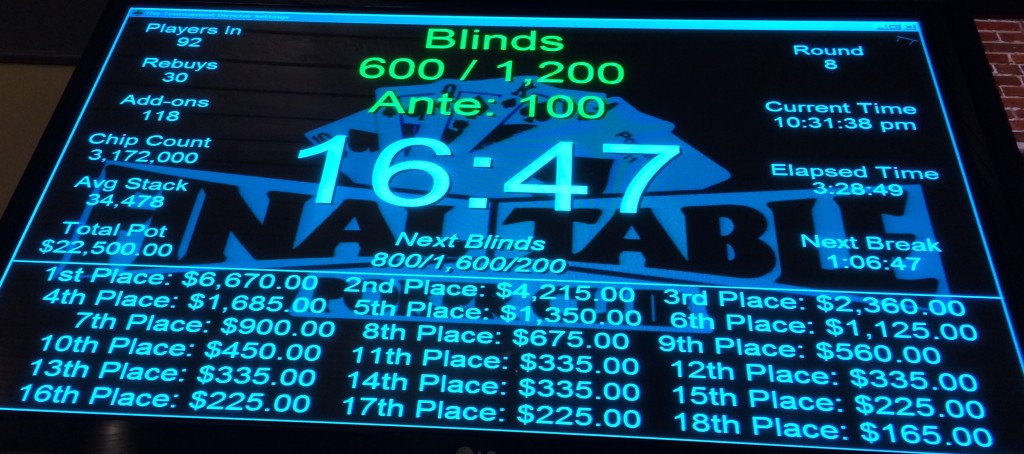 I wasn’t feeling in tip-top condition during the day, but I really hate to miss this monthly event, because it’s one of the best values in town. I got off to a good start building up a stack of nearly 40K by the first break. After the break, things started to go sour, as I called off a bunch of chips with K♦ J♦ on a jack-high flop against a K♠ T♠ flush draw that got there on the turn. Picked up a few chips shoving 8X 8X against 8X 8X on a 4X 4X 2X 7X board. A couple other raises went nowhere and, I was down to under 15BBn when I 4-bet with K♠ Q♠ then called an all-in for more against J♦ J♣. The board ran out A♥ T♥ 9♦ 8♥ 6♥ and I was out.