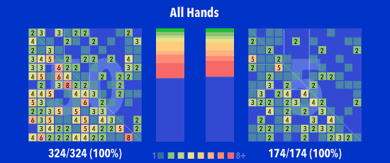 I was dealt 150 more hands (that are in my hand history) than player 5 (my charts are on the left side), but the histograms between the hand charts show proportionally how the hands dealt fit into the Sklansky-Malmuth hand groupings. The classification bands are practically identical in size; I actually got more hands considered “good” than player 5 (the uncolored portion of the histogram on the right is larger than that on the left, indicating that a higher percentage of player 5’s hands fell outside of the eight Sklansky-Malmuth zones).