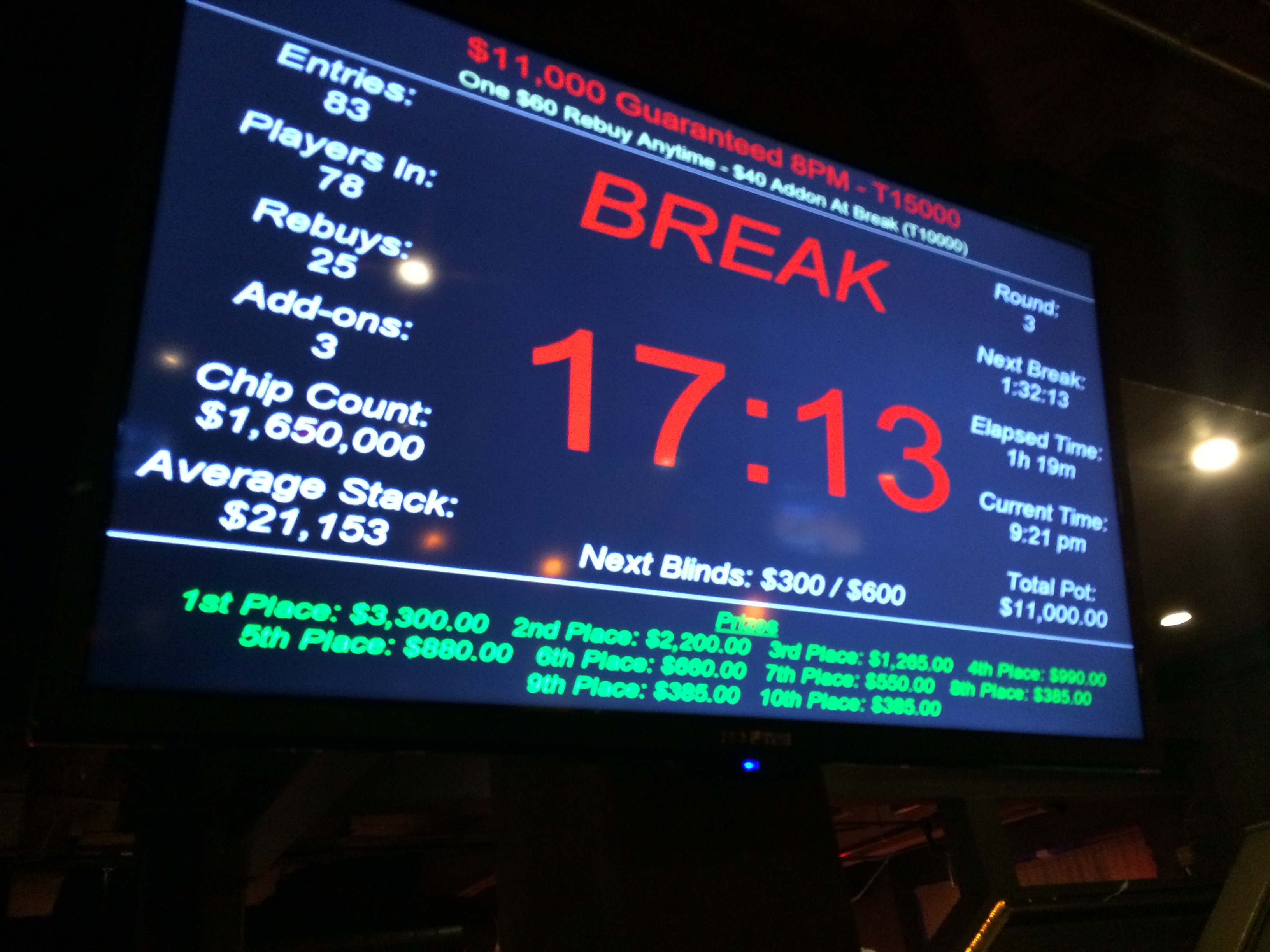 Lost my first buyin all in pre-flop with AX QX v 7X 7X. Rebought and went out on the last hand before break after I flopped trips from BB in a limped pot then lost to a flush draw who called my all-in. Saved myself the add-on (prize pool in the image isn’t complete, they hadn’t put in all the add-ons yet.