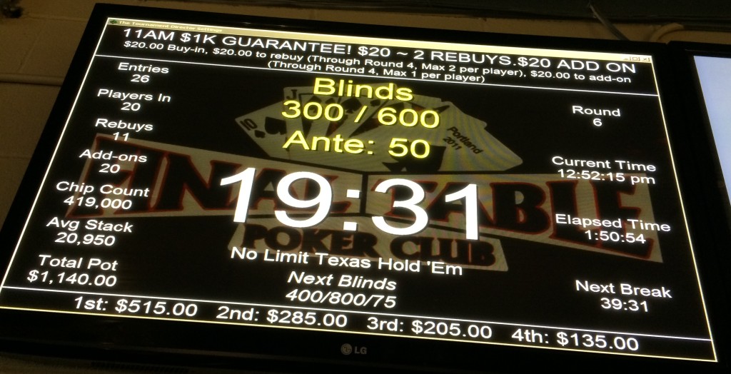 I hadn’t been into Aces Full for a while. Their daily noon game allows two live rebuys, but there isn’t an add-on. I don;t usually like rebuys, but I did one after having my jacks lose to a 4♦ 7♦ that made a straight on the river and paying it off. That guy lost his entire stack to the guy on my right just after the first break, so with two tall stacks of 1K ships, he was one of the three callers against the tens I finally had to shove with less than 4BB. Lost to AX KX, but other wise might have tripled up.