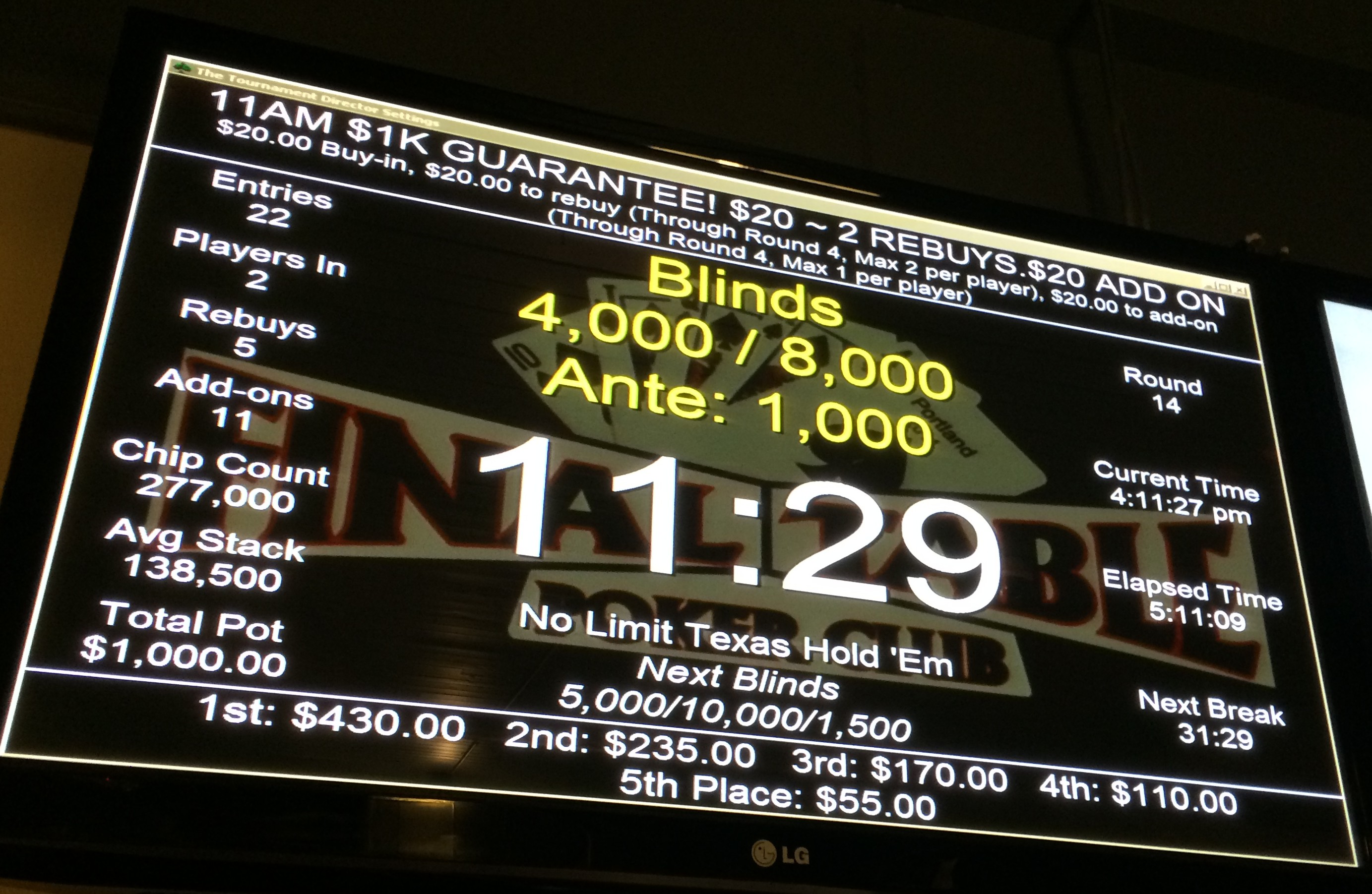 Burned through two buy-ins, didn’t add on, and went out on a bad beat I don’t remember. I just know it was bad.