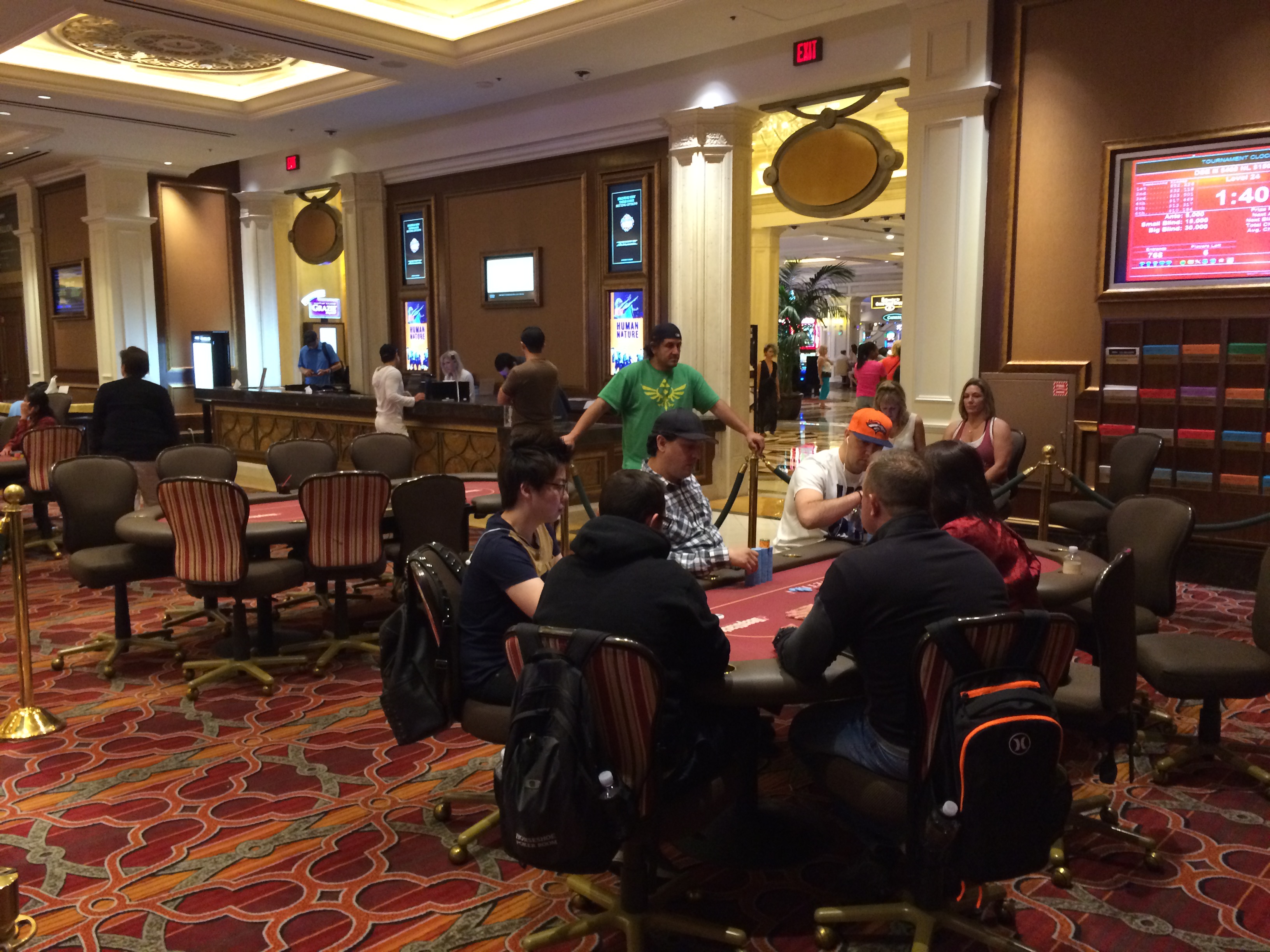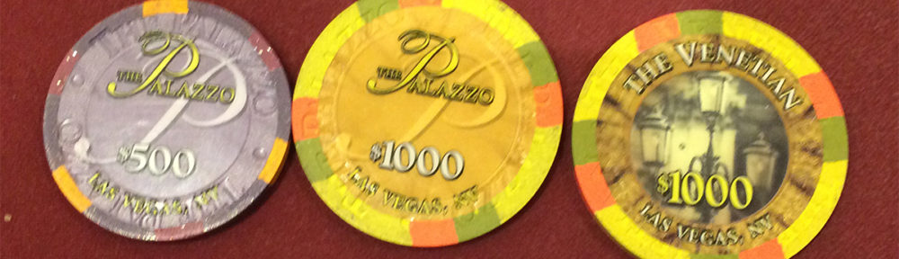 We survivors congratulated ourselves—I had a good time talking to my table neighbor Jason T who just swapped sides after the final table redraw and squeaked into the big money after falling victim to several of my three-bets—and picked up the payout chips from the desk. This almost proved to be my undoing. I stopped on the way to the payout cage to take a picture, then picked the chips up and got in line behind a guy with a couple racks of considerably more cash game chips. He asked if I’d been in the tournament (he may have thought I was in the $150K or the SuperStack that was still running), then asked about the payout, saying “Everyone get $2K”? I looked at the chips in my hand and there were indeed just the two $1K chips. I didn’t see how I could have dropped the $500 chip—I had a death grip on the yellows—so I walked back over the short path I’d taken and sure enough, there on the table where I’d taken the picture below was the $500. If you look close, you’ll see it’s a little smaller than the $1K chips; I’d stacked it on the bottom when I was picking them up, and didn’t notice it got left behind. Vanity may not kill you but it could cost you a pretty $500.