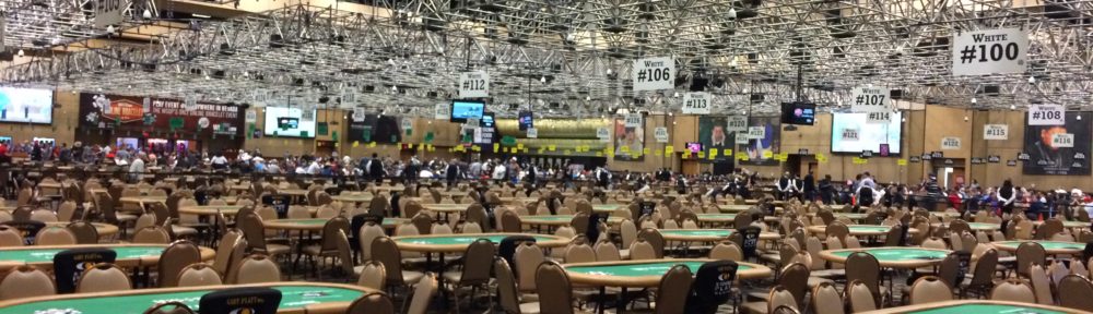 Yeah, that’s the Amazon Room in the Rio Convention Center, and while it looks like it’s empty, on the far side of the room are the 500+ entrants in the first $235 Daily Deepstack of the series, which had a prize pool of nearly $100,000 (I’m changing up my notation so I don’t have to switch back and forth between what I’ve used for the blog in years past and what I’ll have to do as a live reporter for the series.