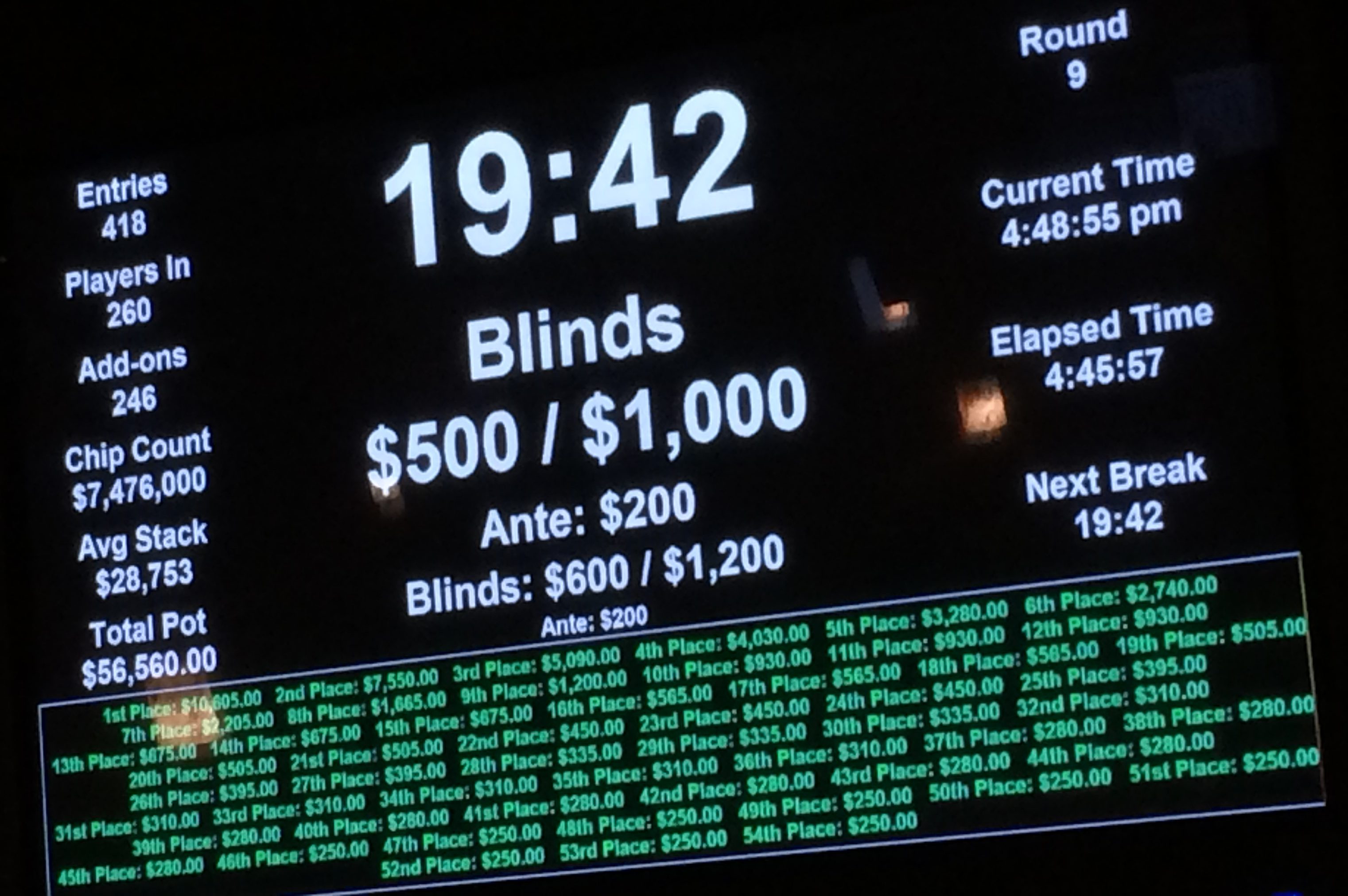 Early in the last tournament, after results from Event #3 had been tallied, Brian announced that the series leader had 65 points. The final event had over 400 entries, with 54 places paid, and by about 9pm, I was the only player remaining in the field with enough points from previous events who could overtake the point leader. Brian told me that if I managed to get to 11th place or better, I’d pick up the needed 44 points.