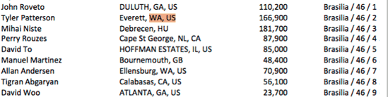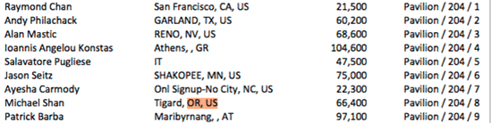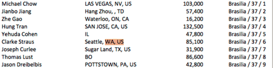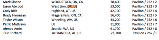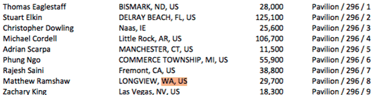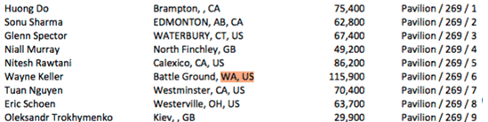 Day 2C of the Main Event is a bye day for Flights A and B. Survivors from all Day 2s come together Saturday for Day 3. Day 2C starts Friday at 11am, levels remain at 2 hours each, five levels are played, and the first level is 300-600 with a 100 ante. NOTE: This is not a complete list of players, there are 77 PNW players in 2C.