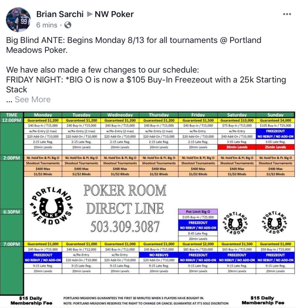 Just after I posted this, Brian Sarchi at Portland Meadows posted on Facebook’s NW Poker group that all tournaments at Meadows will be using the big blind ante starting Monday (when antes come into play, the big blind puts in 2x the big blind, half for antes for all players, and the remainder for the big blind). The Friday Big O and Saturday 7pm tournament also have changes.