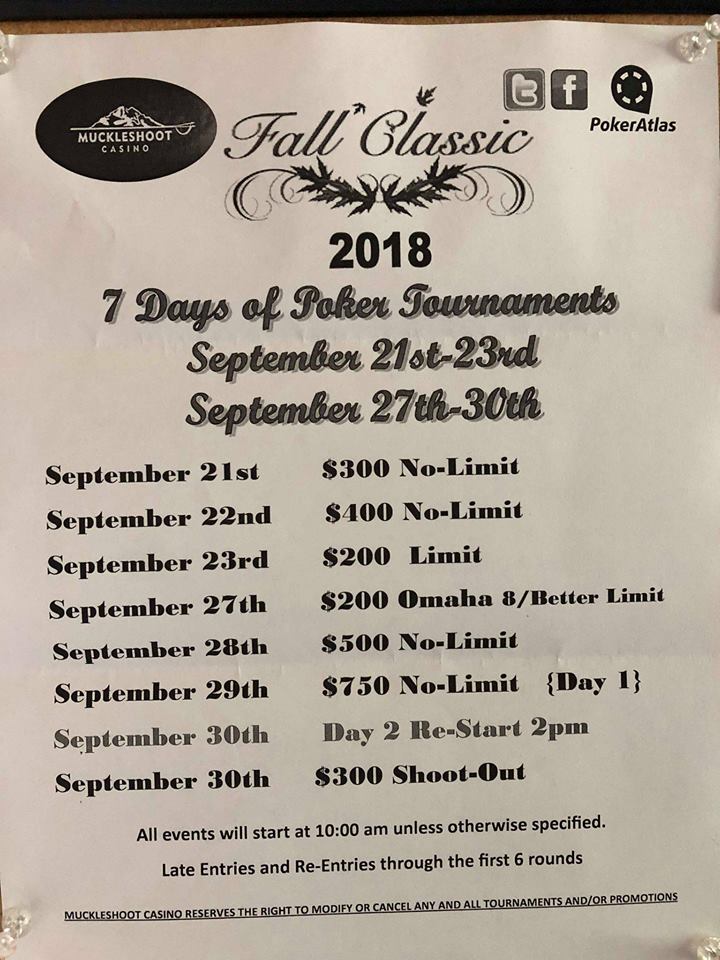 This month’s Muckleshoot Casino Big Bounty tournament ($200 buyin) takes place Sunday at 10:15am. Next Sunday at the same time id the monthly Deepstack ($300 buyin). They still haven’t posted anything on their web site about next month’s Muckleshoot Fall Poker Classic (21—30 September) but that link goes to Facebook. Friend of the blog Steve Roselius posted a snapshot of the flyer from the poker room to Facebook. They’ve typically run satellites to the all or part of the series in preceding weeks.