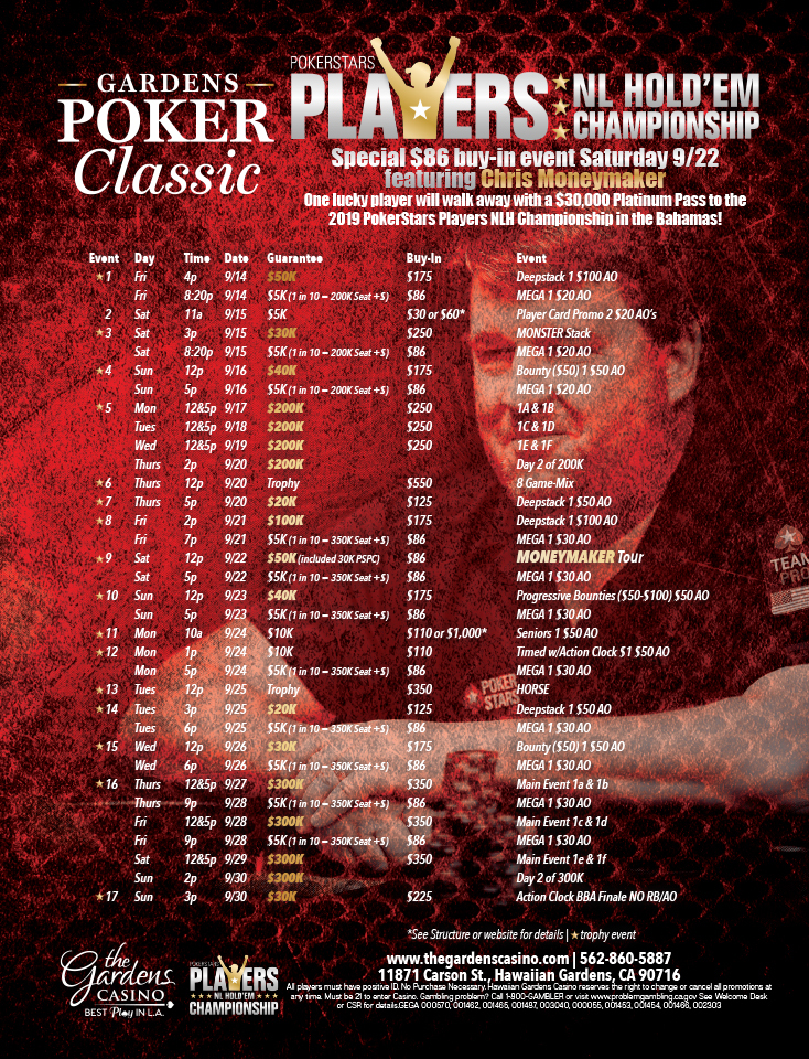 - The Gardens Poker Classic (starting 14 Septepmber) is—among other things—the third stop on the West Coast for the PokerStart Platinum Championship, where you can compete for a ticket to a $25K buyin in the Bahamas in January and $5K in expenses (also known as the cost of a banana at the Atlantis Resort). There are a few other things going on during the Classic, including a $300K TD, a $200K GTD, a $550 buyin 8-Game Mix, some HORSE, and a Progressive Bounty tournament.