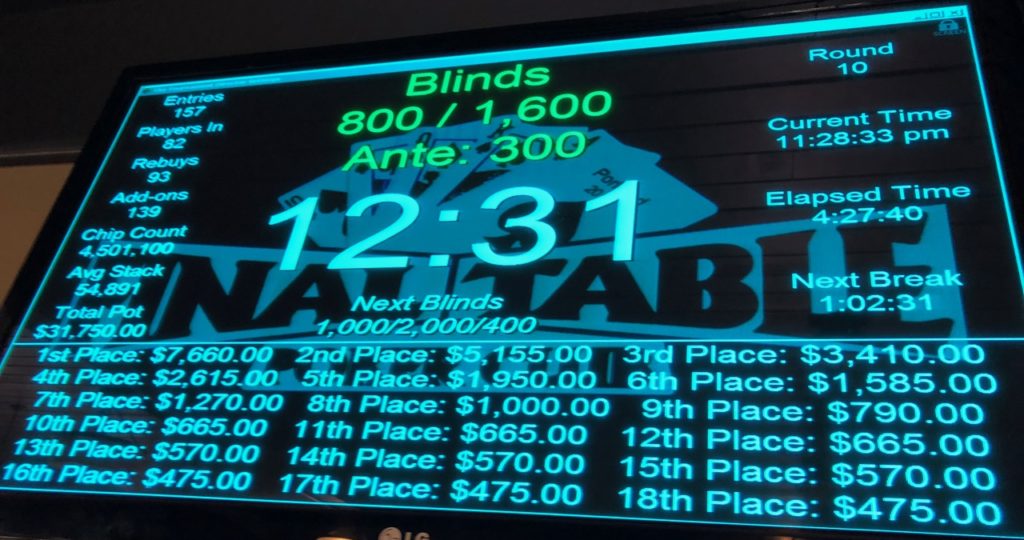 It’s the first Friday of the month, which means a $20K GTD tournament at Final Table at 7pm. It’s $100 for a 12K stack (with an extra $1K if you register before starting time), with a live rebuy ($100 for 12K at any time) and a $50 addon (10K in chips) at the first break. It’s the biggest regular game in town; last month’s prize pool was over $30K!