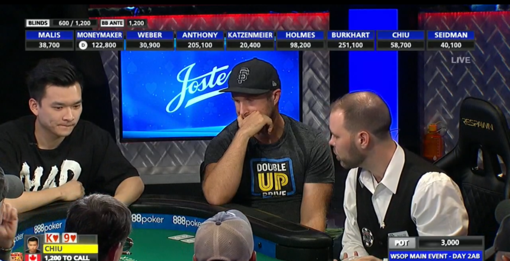 There were 3,248 players coming into Day 2AB from Days 1A and 1B, with another 100 or so electing to late-register before the start of play. Out of that, 1,087 players remain. If you were watching ESPN/PokerGO coverage for the day, it was pretty much the Jacki Burkhart show, as her table featuring Chris Moneymaker was the main feature table for the day, Moneymaker didn’t bust (despite being at risk a number of times), so it stayed that way, and her commanding lead at the table and personality got her a lot of love from the hosts.