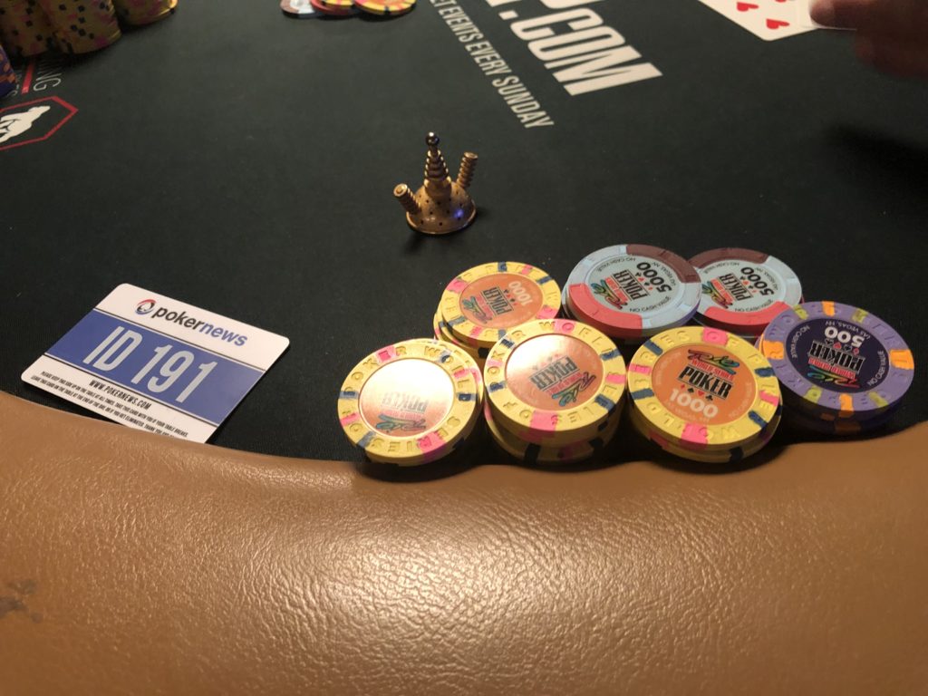 We were early in the break order, so by the next time I did an update on the PokerNews MyStack app, I’d been moved to another table. I got another double-up there that took me to 95k. Warning #1 for anyone using MyStack, if you take a photo (at least on the iPhone) through the app, MyStack does not save the photo to your Photos library! So take the pic with your Camera and add it to the MyStack post from Photos, or you’re never going to have access to that sweet, sweet chip porn, because there’s no way to export the image.
