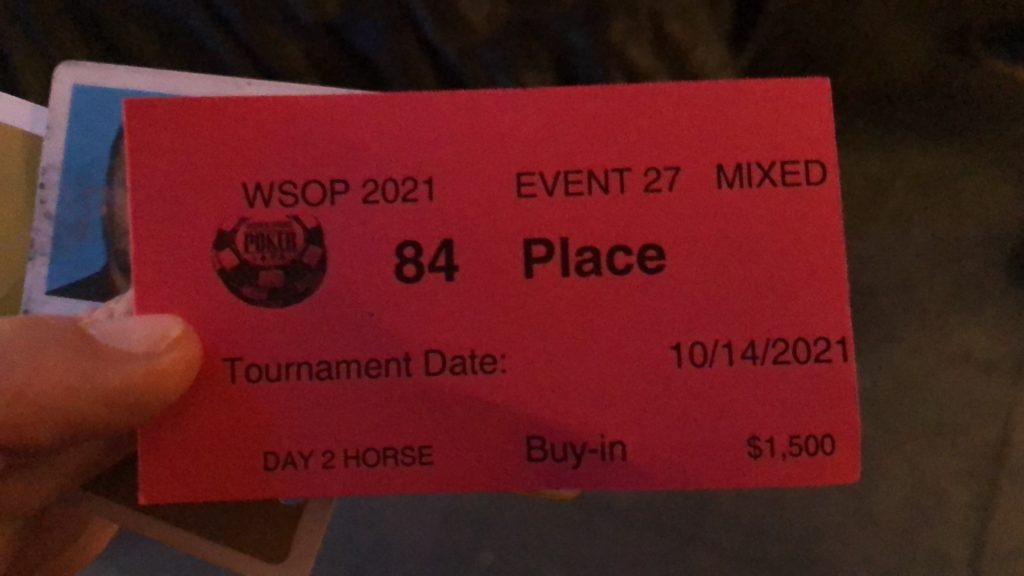 It was a bit of a roller coaster, I have to say. I haven’t played much HORSE live or online in recent years, and I can’t say I remember my game being this swingy before. Maybe I just don’t remember it. Anyway, two hours in, I was n worse shape than when I started, with just three big bets and 45 players to go before the money.