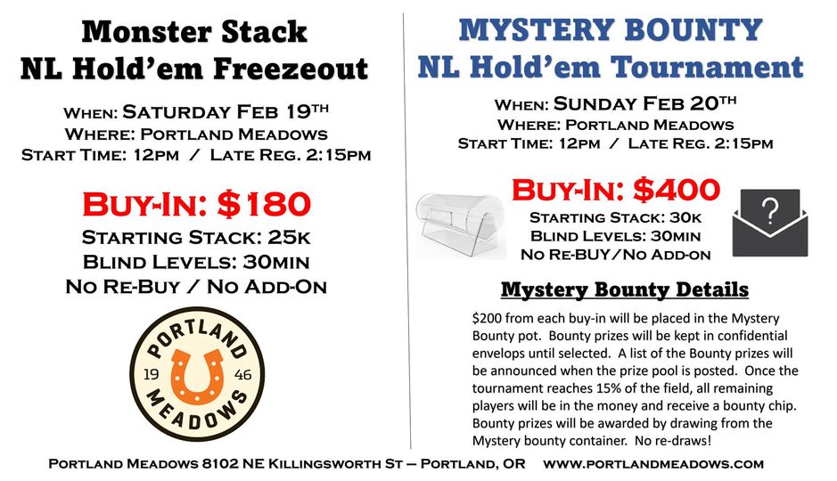 Portland Meadows is holding two special events in February. On Saturday the 19th is a $180 NLHE Freezeout and on Sunday the 20th is their first NLHE Mystery Bounty. The Bounty is a $400 buy-in, and once the field is down to 15% of registrants, anyone who knocks out another player gets to draw from the barrel to see the amount of the bounty they receive, from $400 to $5K. Both tournaments are freezeouts, with no add-on, and 30 minute levels.