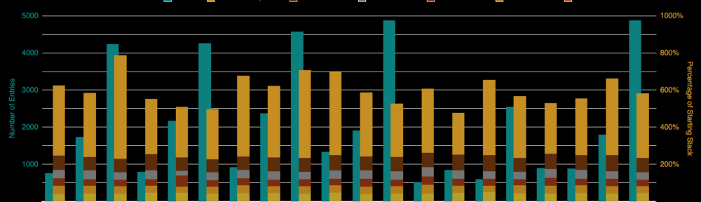There wasn’t any statistical correlation between the number of entrants on each day and the stack distribution that I could find, the biggest end-of-day stack between 2011 and 2015 was on a Day 1A (2012). In 2011, the biggest ending stack was on Day 1A, and in 2014 the biggest stack on 1A was larger than on 1B despite a field only a third the size.