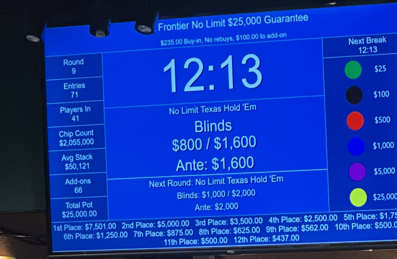 After some success at Last Frontier early in the year in LHE, I decided to try my hand there at NLHE and ran into a bit of a buzzsaw. Ran KK into AA just over an hour in and lost the equivalent of a starting stack. With the slower structure, I still had 40bb. Managed to get to the add-on break with 5K and got an extra 15K, then ran it up to 23K (57bb by then).