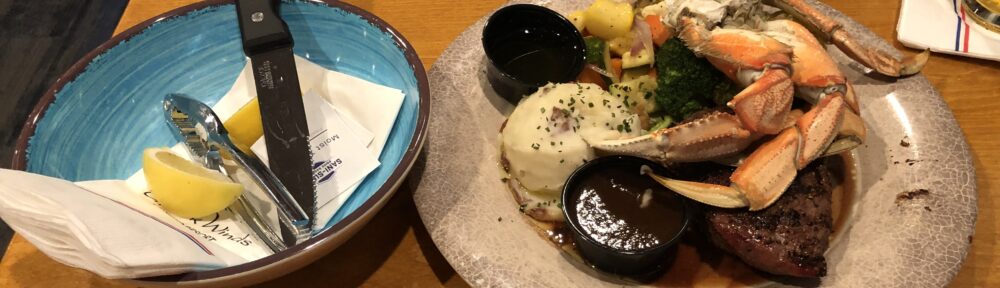 While I was out of the tournament room, I’d noticed there was a Thursday night steak and crab special at the Seafood Grill where I’d had breakfast with my father the other day, and told Brad I’d reciprocate his generous steak dinner from last night, then went to play some cash.