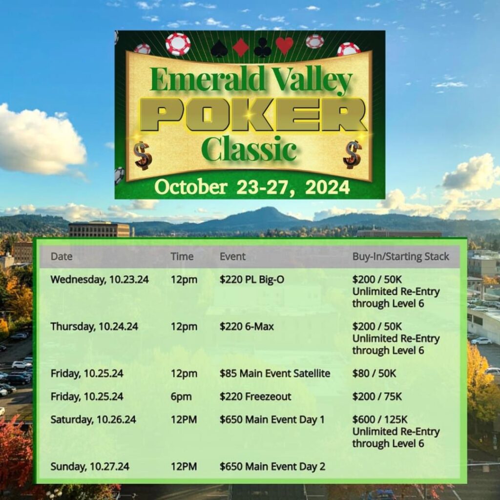 October is off to a decent start already. Next week is Portland Meadows’ Main Event Series, featuring a Big O tournament Thursday and their $1000 buyin on Saturday. There’s a $30K GTD at Final Table the Saturday after that (the 19th). And the week after that is the High Mountain Emerald Valley Poker Classic in Eugene.
