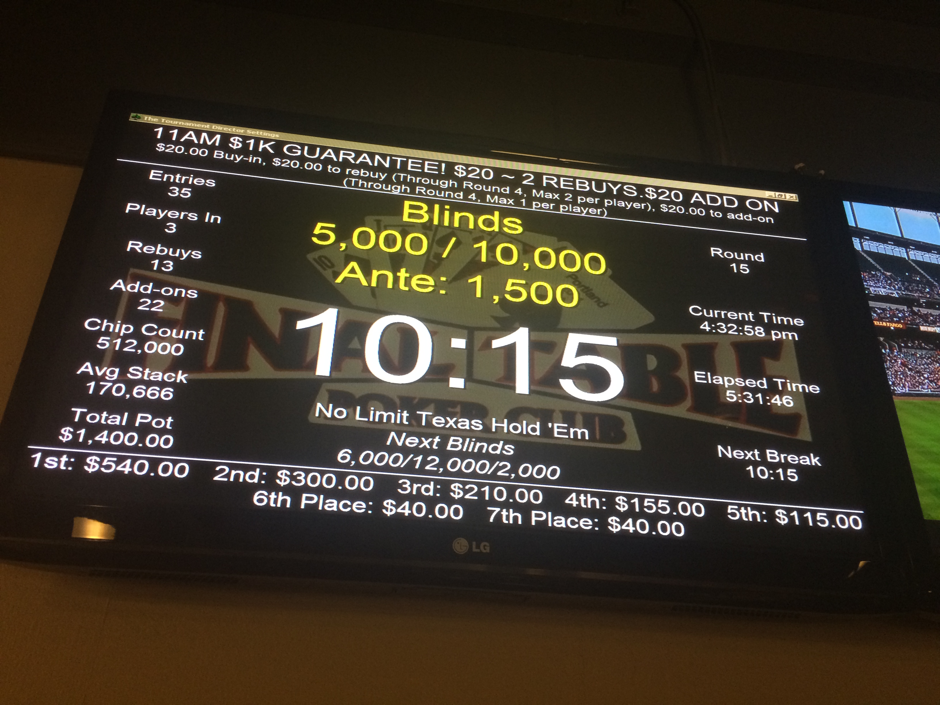 Both this week and last, while I had the lead and could theoretically have asked for more in an ICM deal, the amount of money that would have been involved wasn’t really worth the hassle of holding out for more. The three-way ICM distribution yesterday, even with first place on the payout schedule being more than two-and-a-half times third place, and me having half-again as much as either of the other two players, had only about a $50 gap (ten percent of the scheduled first prize) between first and third. I said to just split it three ways evenly and, not surprisingly, they both agreed. There were only 51 big blinds in play. JB—who busted in third place before the deal last week after coming to the final table as the short stack—was knocked out again just before the deal.