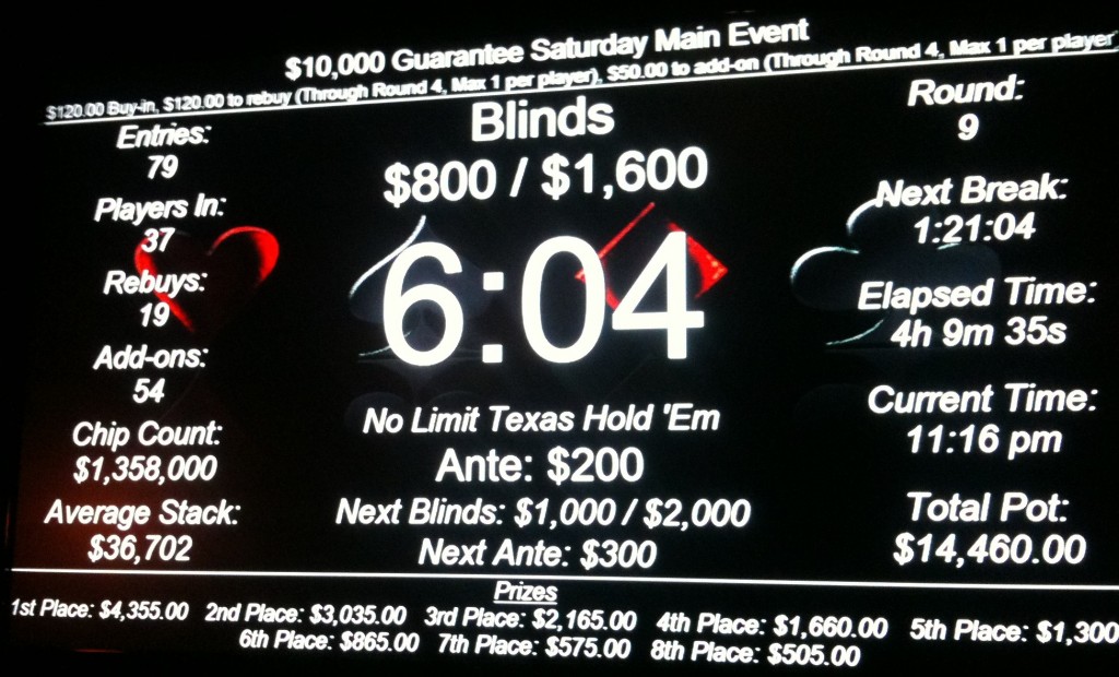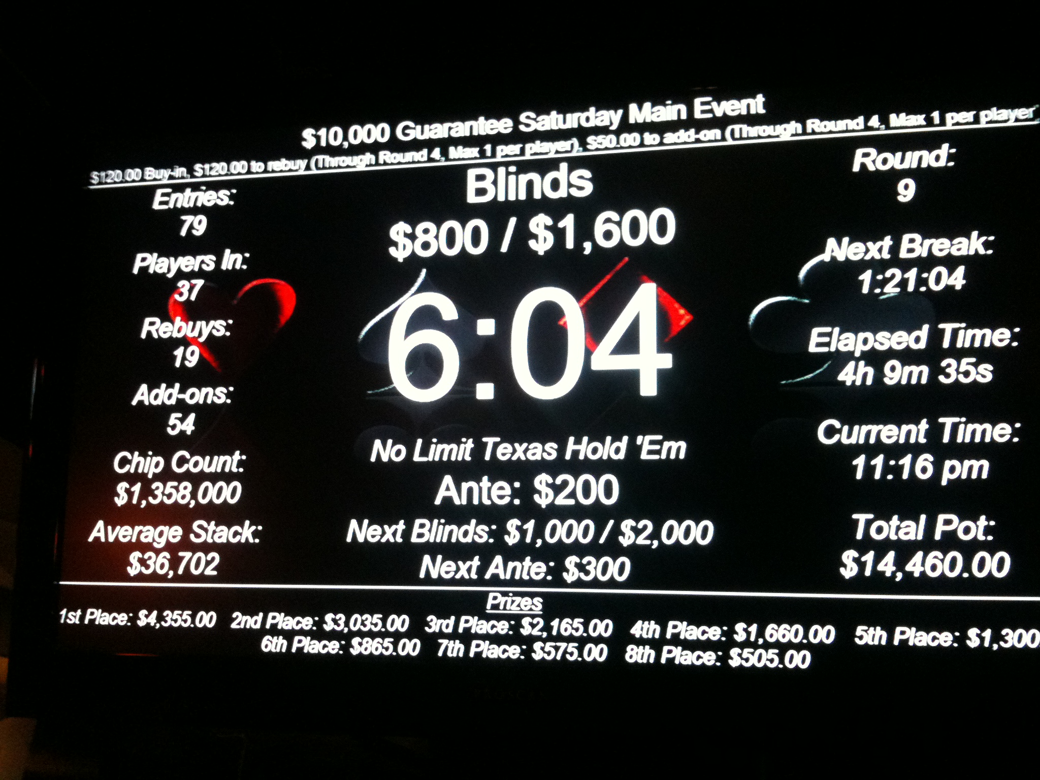 He had a friend with him who kept trying to help stack his chips for him and who he kept kicking. I was tempted to ask that only players and staff be seated at the table, but I held my tongue. Around 3:30am, everyone was still within a range of a 200,000 chips, the blinds were 8,000/16,000/3,000 and a chop for a little over $2,400 each was proposed and accepted. And once again, I forgot to take a picture of the screen.