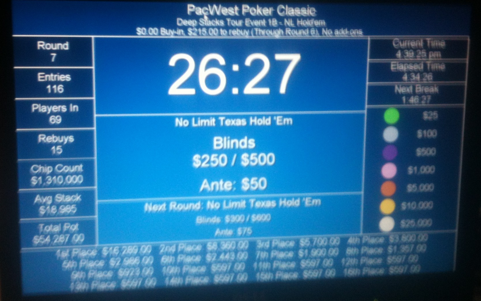 @LIVEDeepstacks tweeted that there were 157 entries to Day 1A (Saturday) down at the Chinook Winds Casino in Lincoln City. I had to be in Portland Saturday night, so there was no way I could play Day 1A (Day 2 was scheduled for Monday).