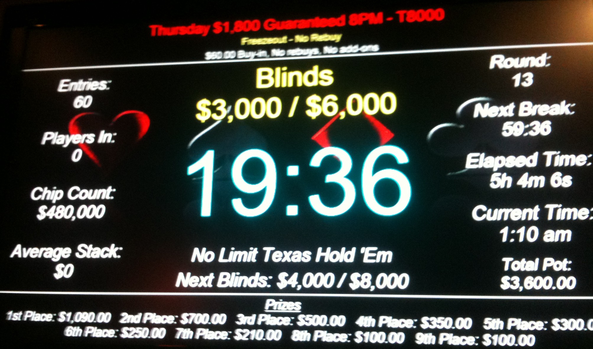 Except that when I got there the door was locked and there was a sign saying they were closed for the evening. Yikes! I was on the loose, Encore wouldn’t have a game open for an hour, I was probably too late to make the 8pm at Aces. It just left the dreaded Final Table. So I high-tailed it out Glisan.