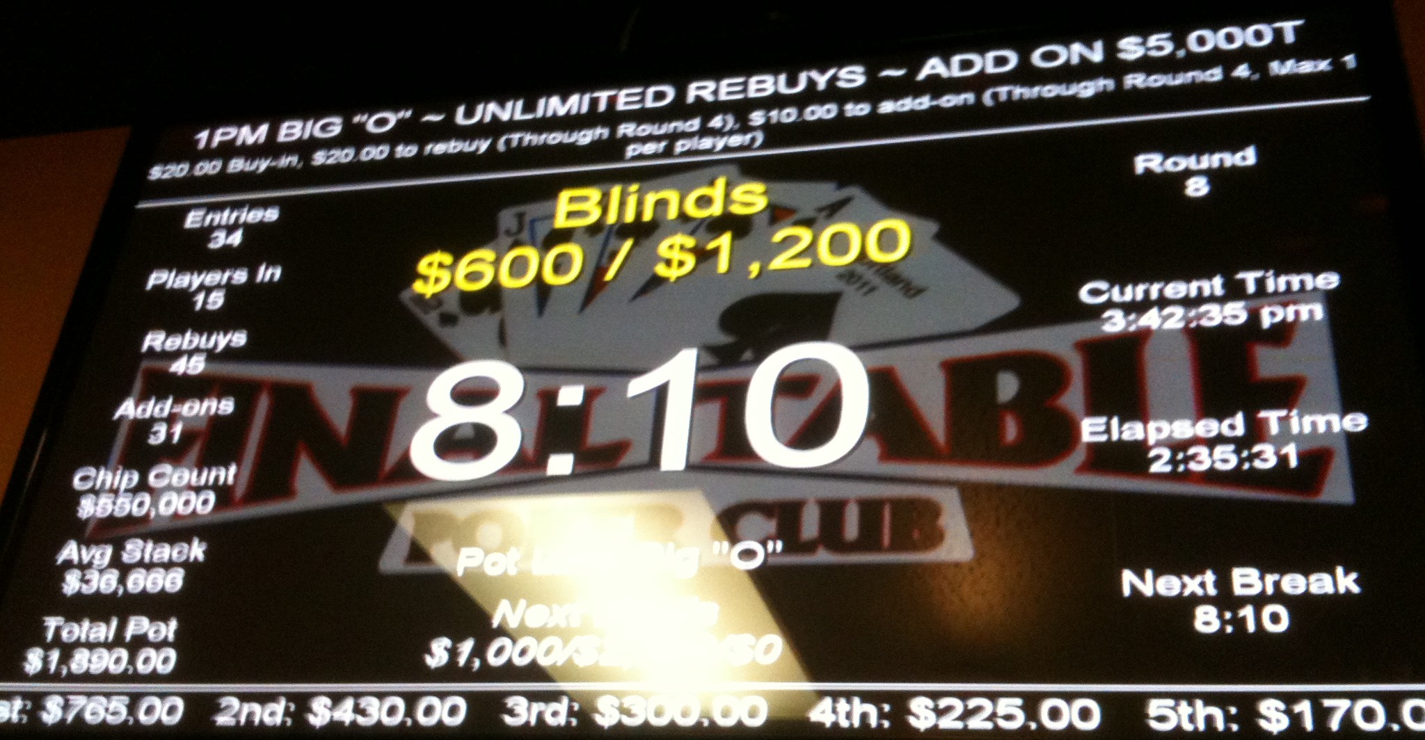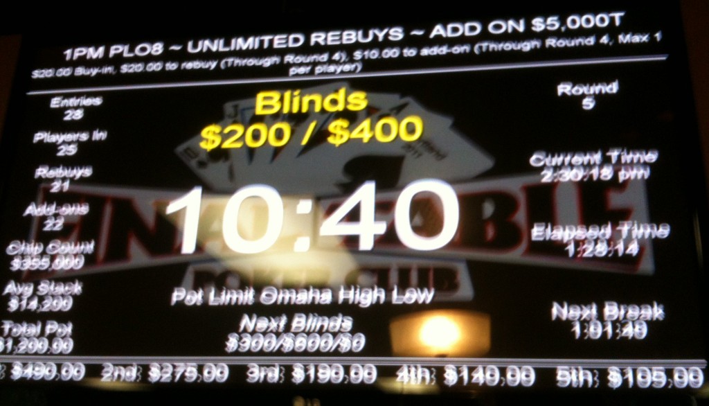 Games that induce a lot of re-buys, like the afternoon Pot Limit Omaha Hi-Lo tournaments at The Final Table ($10 door, $20 buy-in, $10 add-on), can change the math a little. It’s not uncommon for there to be nearly as many re-buys as original entries, which can juice the pot a bit. One game late last year had 28 entries, 21 re-buys, and 22 add-ons, for a $1,200 pot (30:1). That’s still not a great number, though, with the median payout at just under 16% ($190), for a potential ROI of only +222%; more money but not as high a return as the median payout in the PPC game. Again, the top end does better—+450%—but that’s just keeping your head above water for someone with an ITM of 14% (and it means you need to take first place every time you cash).