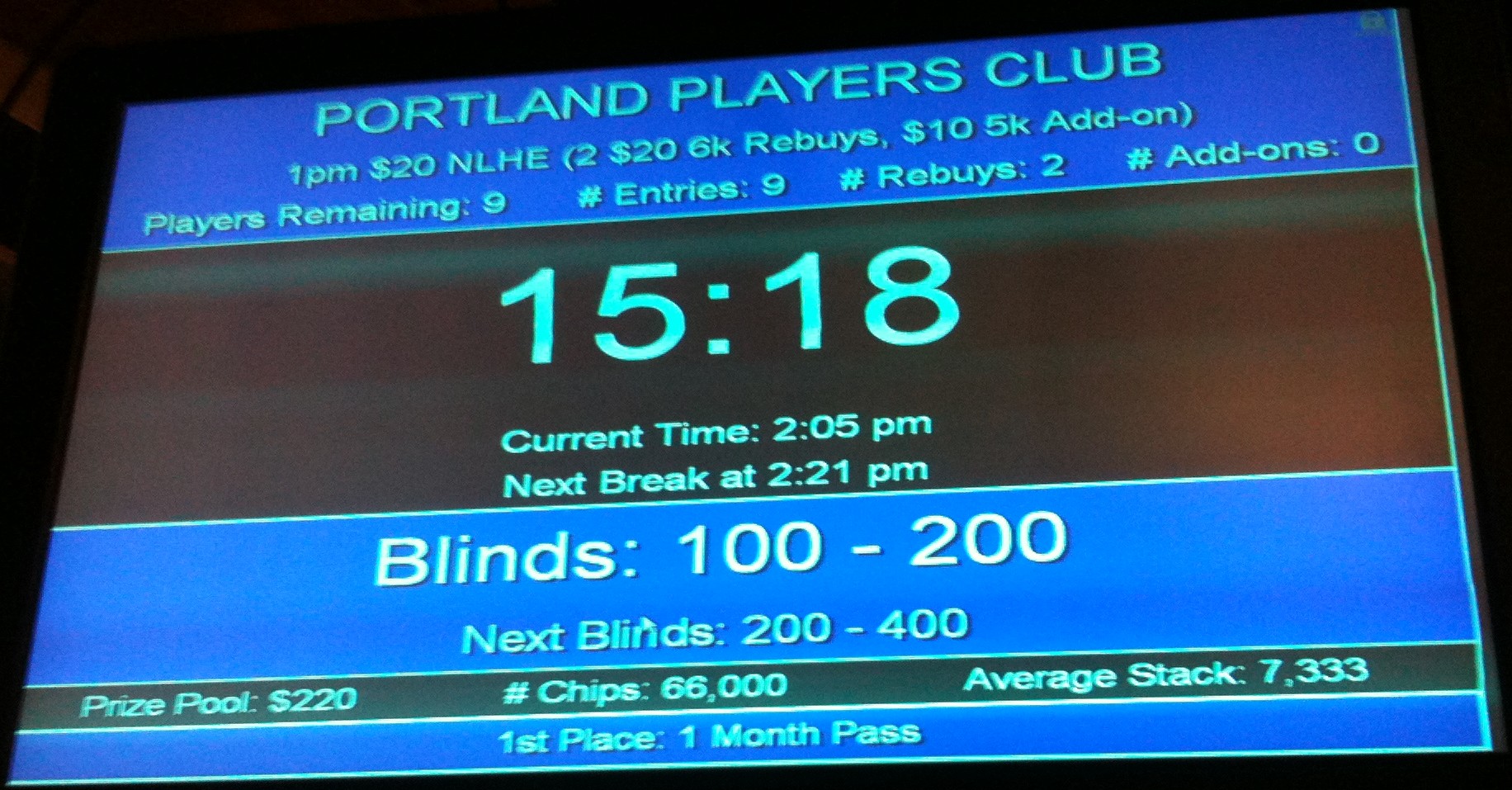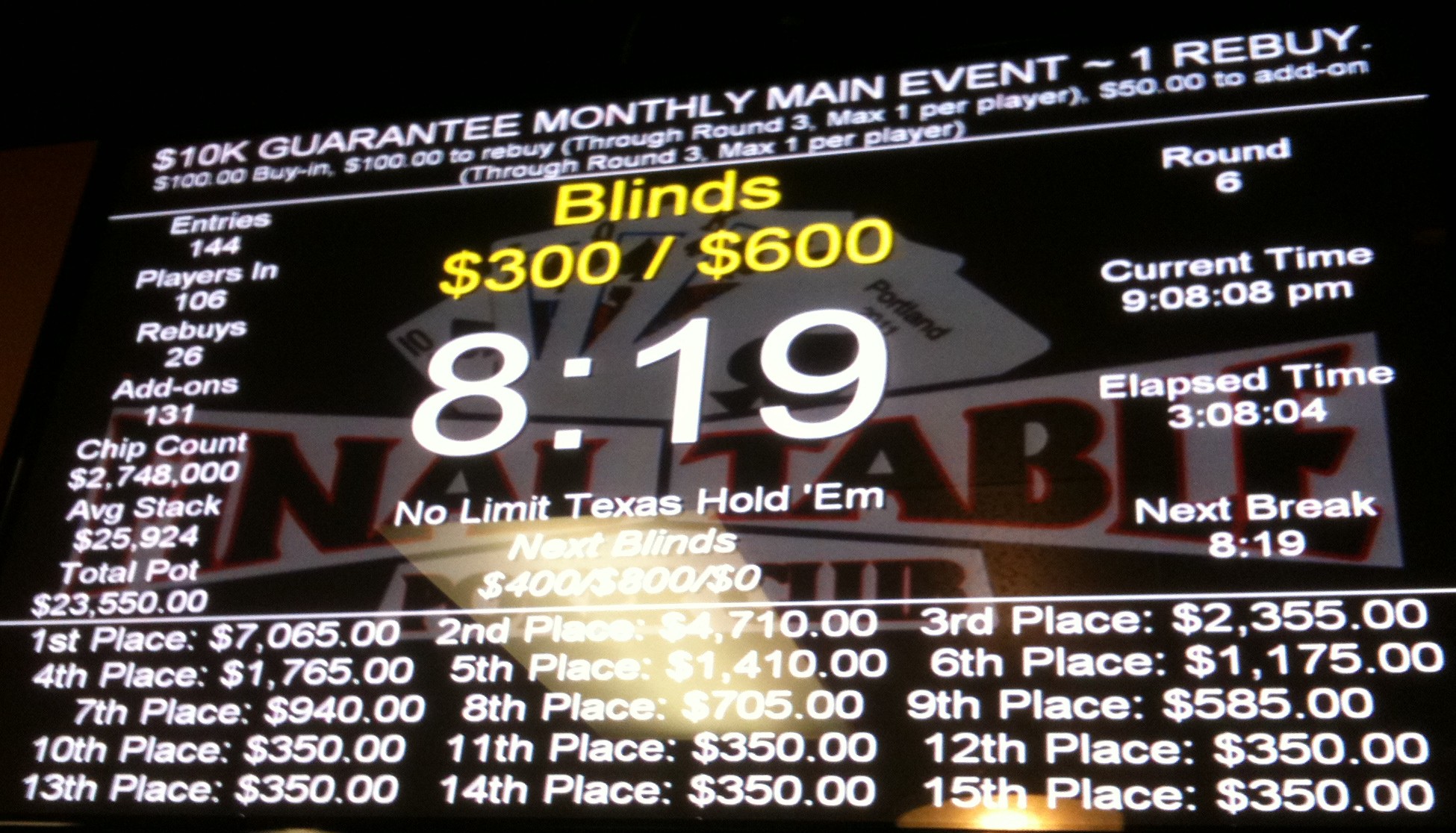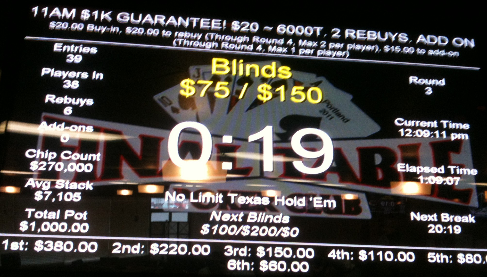 Small-field tournaments in Portland—i.e. those with 20-30 players—pay about 45-50% for the top prize, with three or four places total paying (before any bubble agreements), and with the median payout in the range of 20-30% of the pot. The pot to basic cost ratio varies considerably depending on the tournament structure and club. An 11am $250 guarantee freeroll tournament at Portland Players Club ($5 door, $5 pre-add-on, $10 add-on) with close to 30 players can generate a pot to cost ratio of nearly 25:1 with a third of the players re-buying (I don’t include re-buys in basic costs because as I’ve explained, rebuys are the death of ROI). That means the median payout in those tournaments is approximately 625% of your basic cost. If you tip your dealer 10% of your 625% prize ($125), your ROI for the game is +285%, which sounds great, but only if your ITM is better than 26%. Of course, if you win the top prize in that tournament you’re doing better, but then if you cash in third you’d better be cashing in almost every game you play.