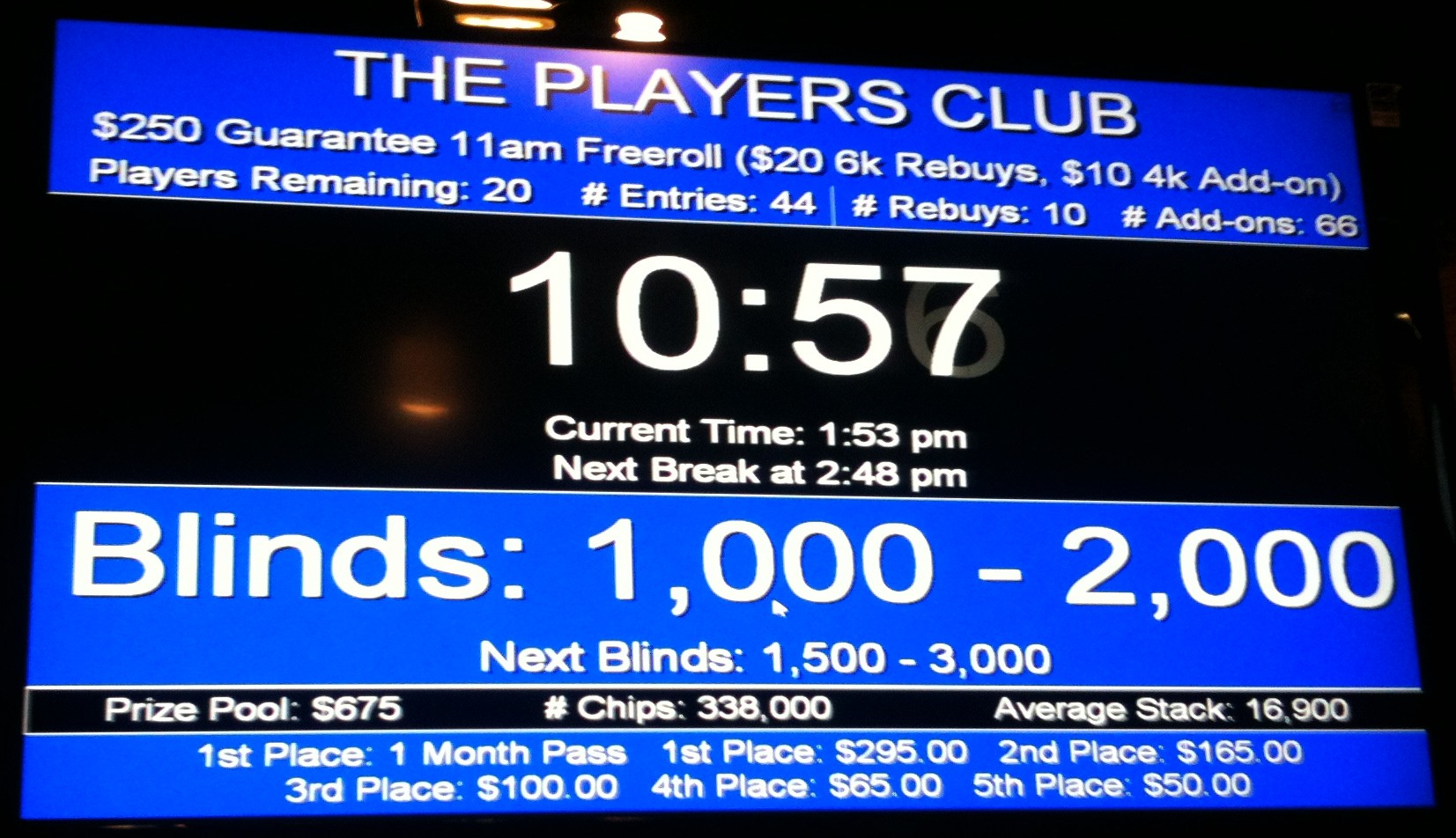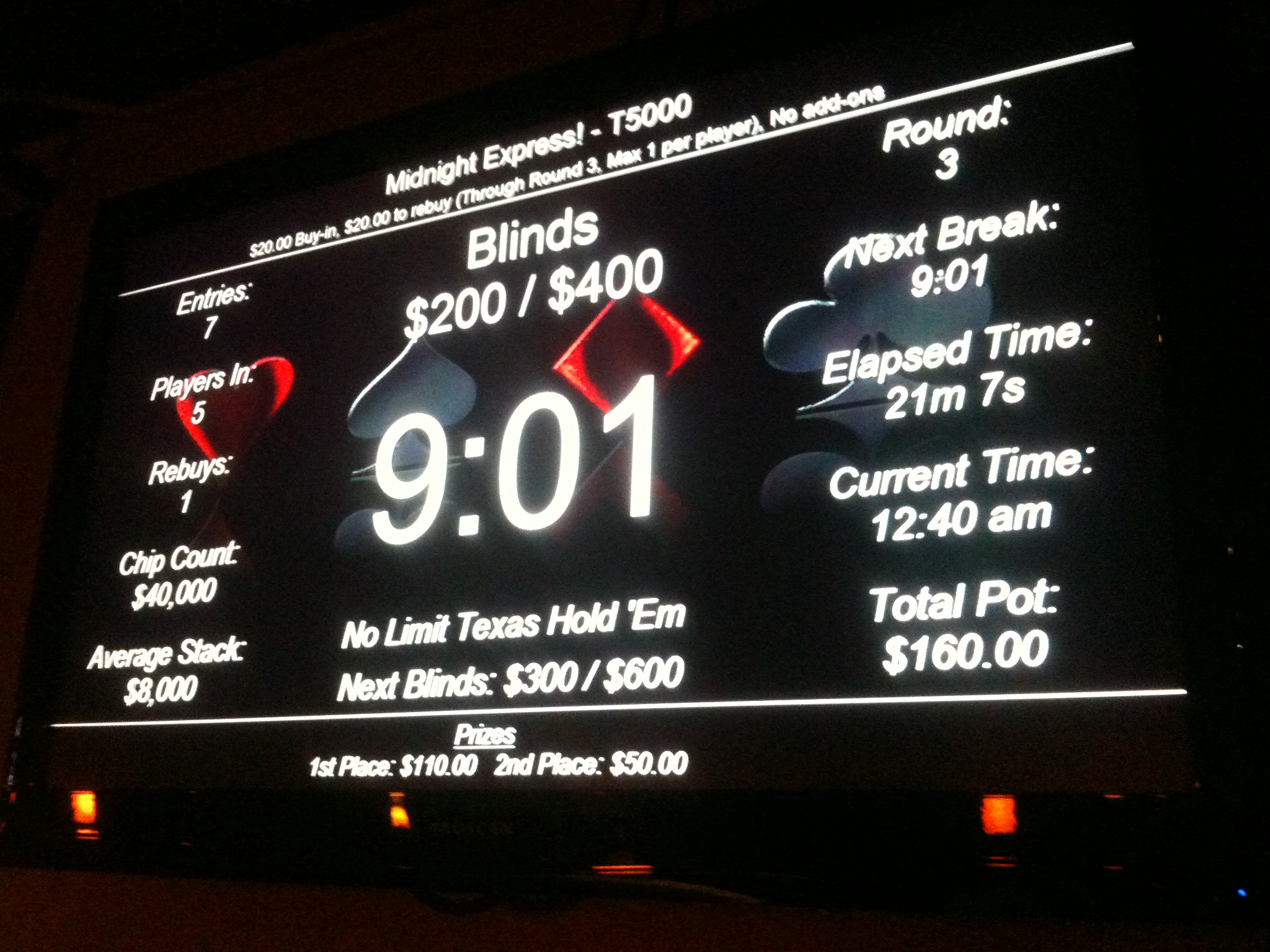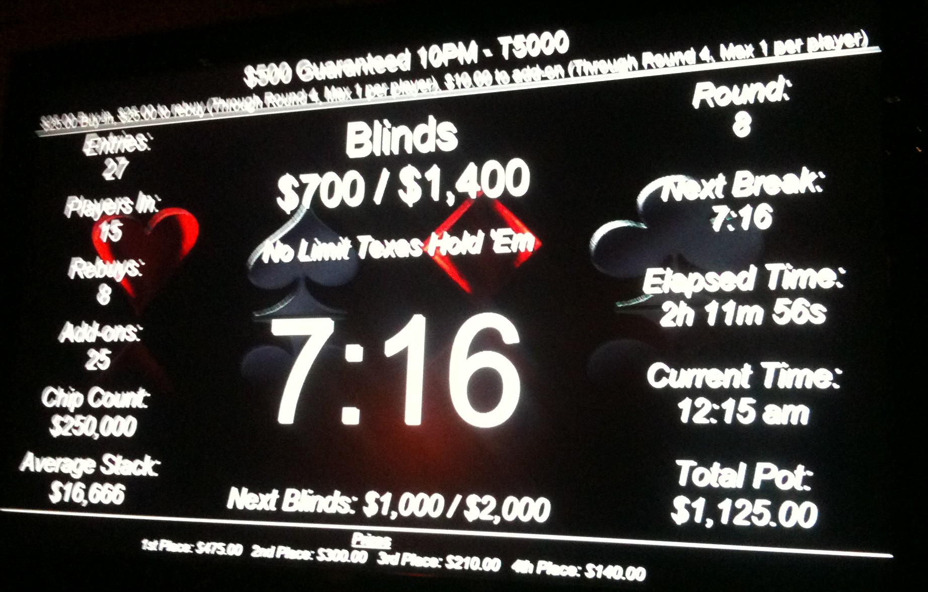 Small-field tournaments in Portland—i.e. those with 20-30 players—pay about 45-50% for the top prize, with three or four places total paying (before any bubble agreements), and with the median payout in the range of 20-30% of the pot. The pot to basic cost ratio varies considerably depending on the tournament structure and club. An 11am $250 guarantee freeroll tournament at Portland Players Club ($5 door, $5 pre-add-on, $10 add-on) with close to 30 players can generate a pot to cost ratio of nearly 25:1 with a third of the players re-buying (I don’t include re-buys in basic costs because as I’ve explained, rebuys are the death of ROI). That means the median payout in those tournaments is approximately 625% of your basic cost. If you tip your dealer 10% of your 625% prize ($125), your ROI for the game is +285%, which sounds great, but only if your ITM is better than 26%. Of course, if you win the top prize in that tournament you’re doing better, but then if you cash in third you’d better be cashing in almost every game you play.