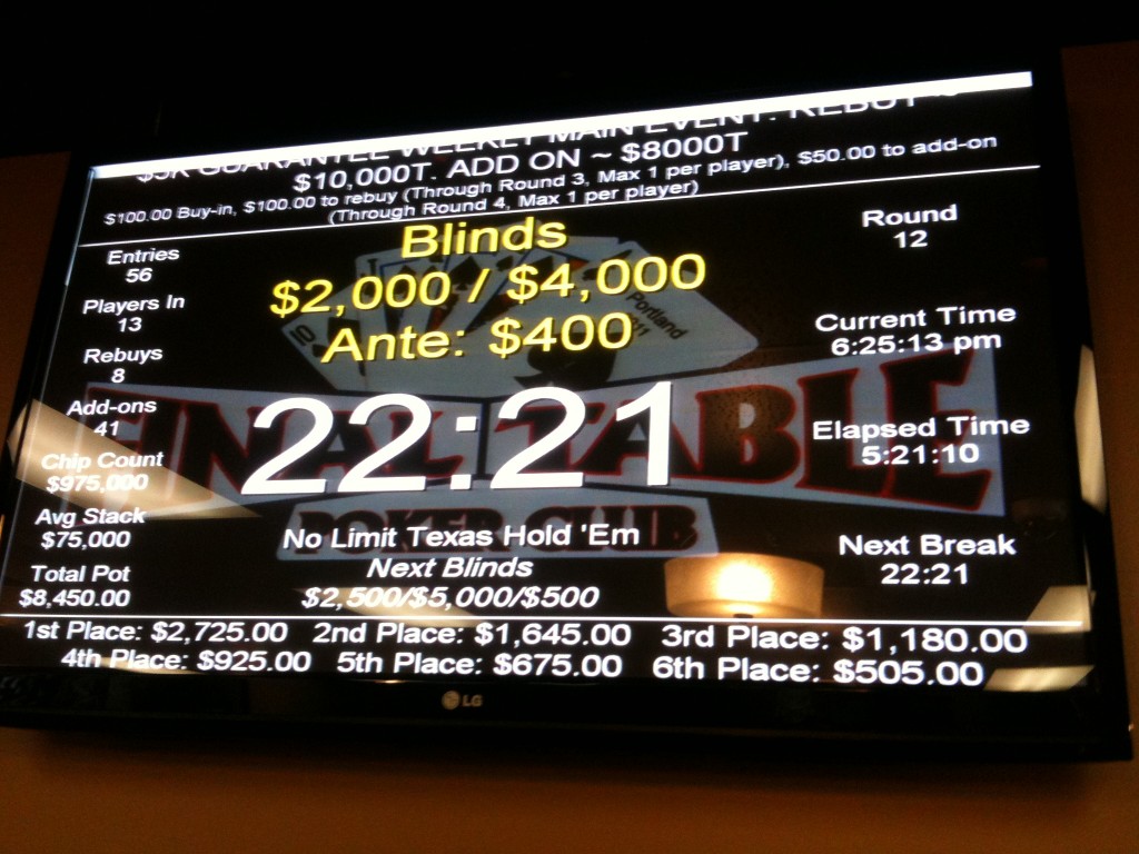 I hadn’t been in PPC since the middle of last May, preferring the comfier chairs of Aces, but a Facebook invite from their new owner and the potential for nearly-free money lured me in. The format allowed for re-buys during the first hour and an add-on, all for 4K in chips. About 70 players started.